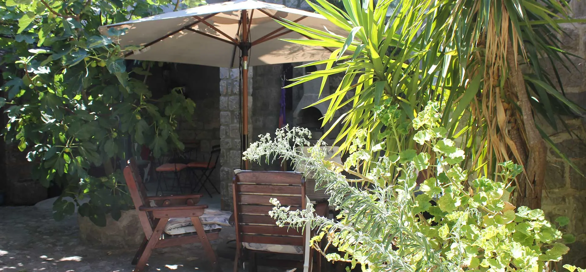 Im begrünten Innenhof kann man grillen und auf einer hölzernen Gartengarnitur im Schatten eines großen Sonnenschirms speisen und entspannen.